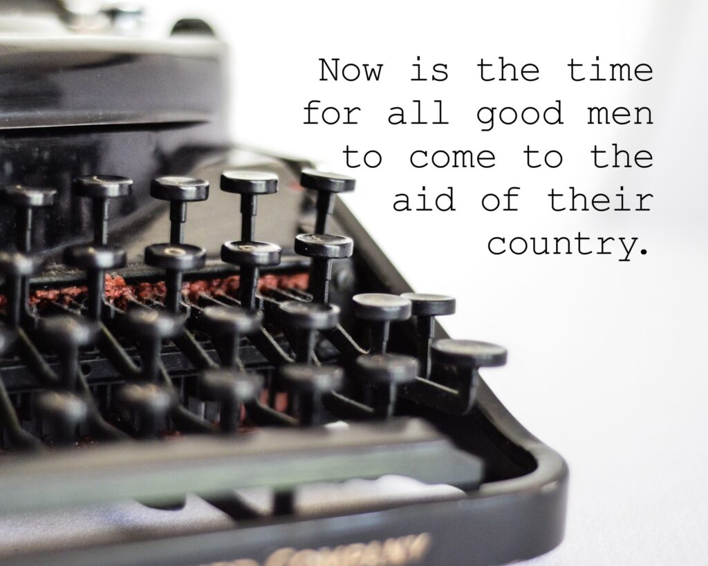 Who came up with that line, anyway? We never asked. I’ve just learned it was created as a typing exercise by a man named Charles E. Weller and published in his popular book THE EARLY HISTORY OF THE TYPEWRITER in 1918. Originally, the line read, “…come to the aid of their party,” but with the advent of WWII, the “country” version became more popular and was included in many typing exercise books.