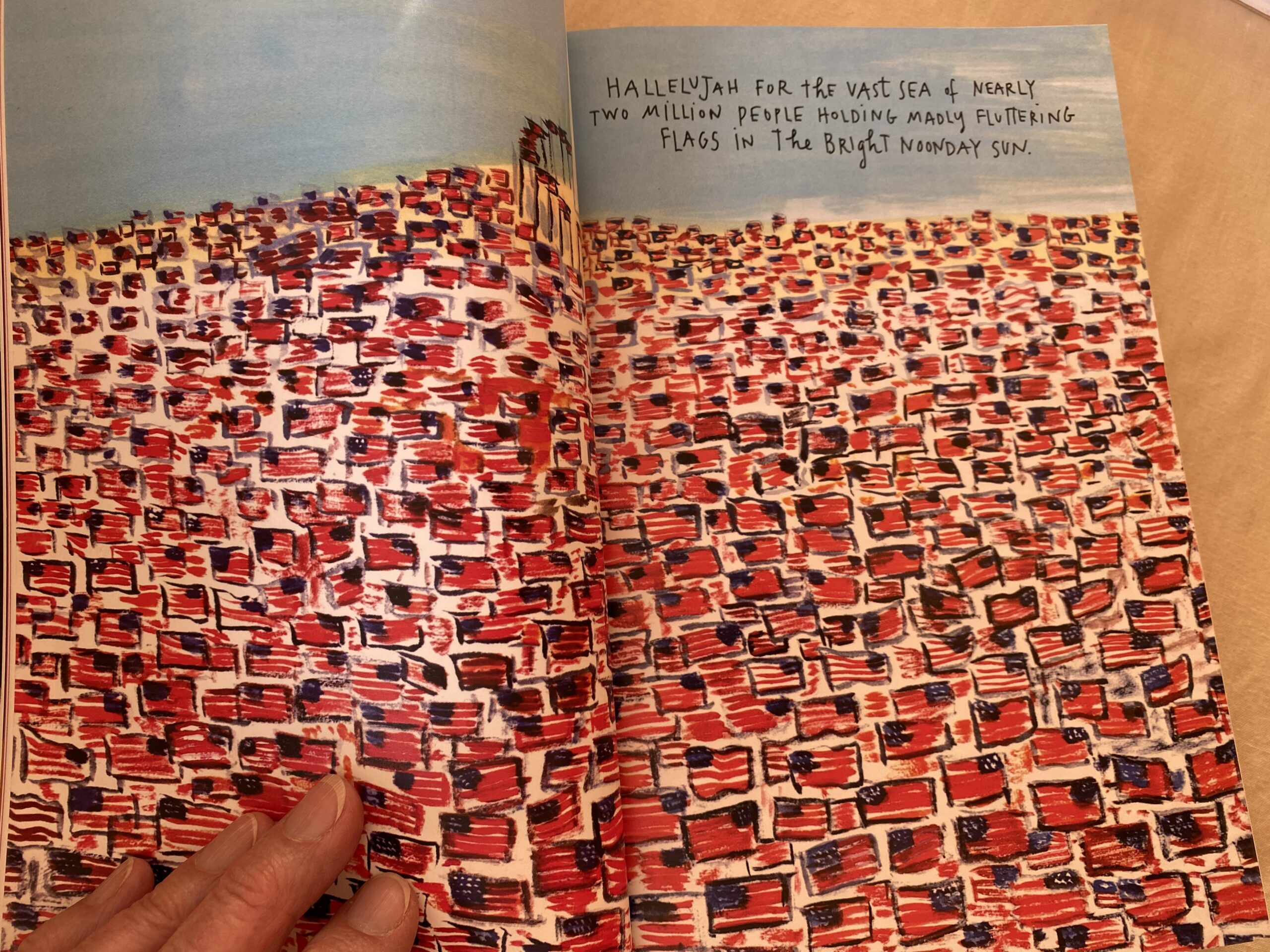 And across a two-page spread of shoulder-to-shoulder small American flags at the inauguration she writes, “Hallelujah for the vast sea of nearly two million people holding madly fluttering flags in the bright noonday sun.” Such hope and optimism emerges from her on every page.