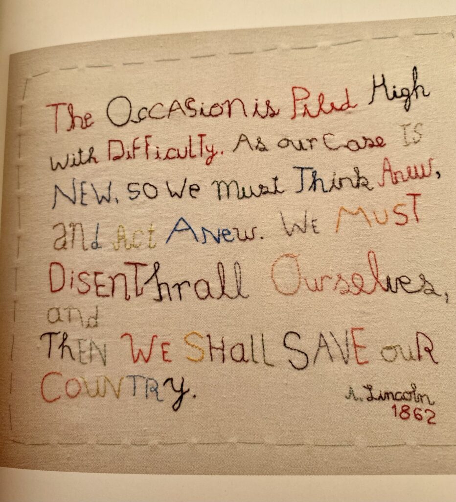 And she shares an embroidered sampler of Abe’s words (so important for us to heed today): “The occasion is piled high with difficulty. As our case is new, so we must think anew, and act anew. We must disenthrall ourselves, and then we shall save our country. – A. Lincoln 1862”